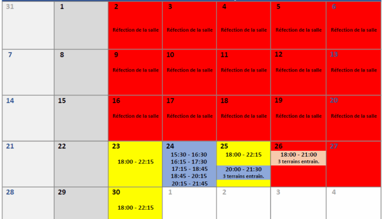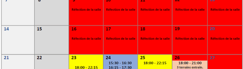 Voici les créneaux loisirs et entrainements disponibles pour la fin du mois de Septembre après la réfection du sol !!!